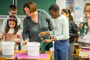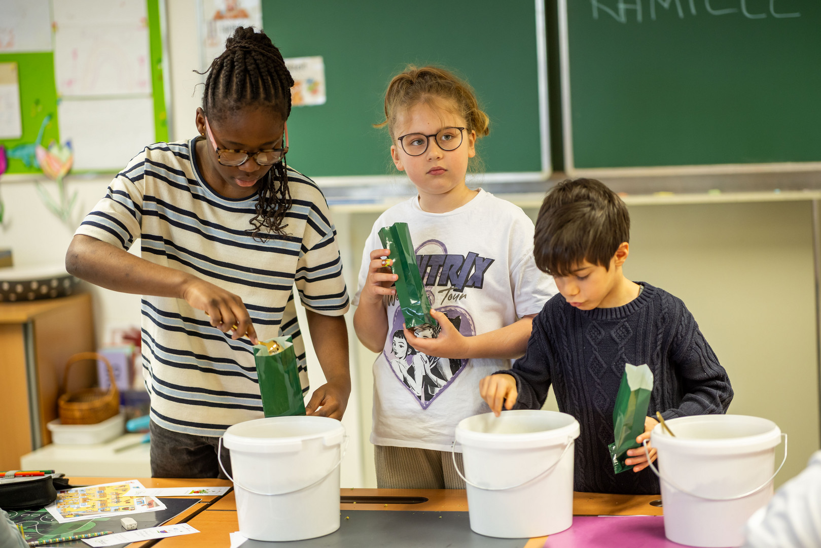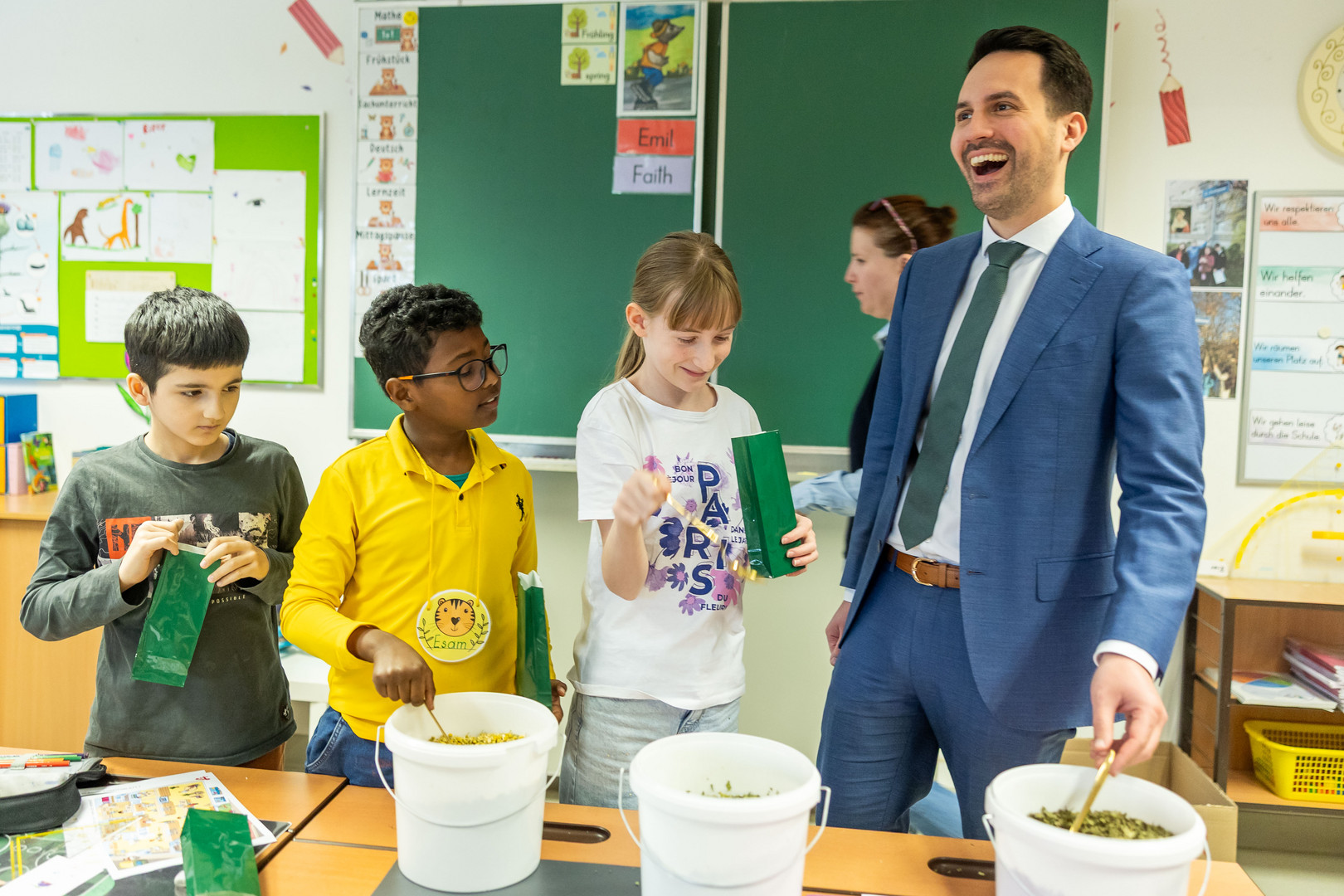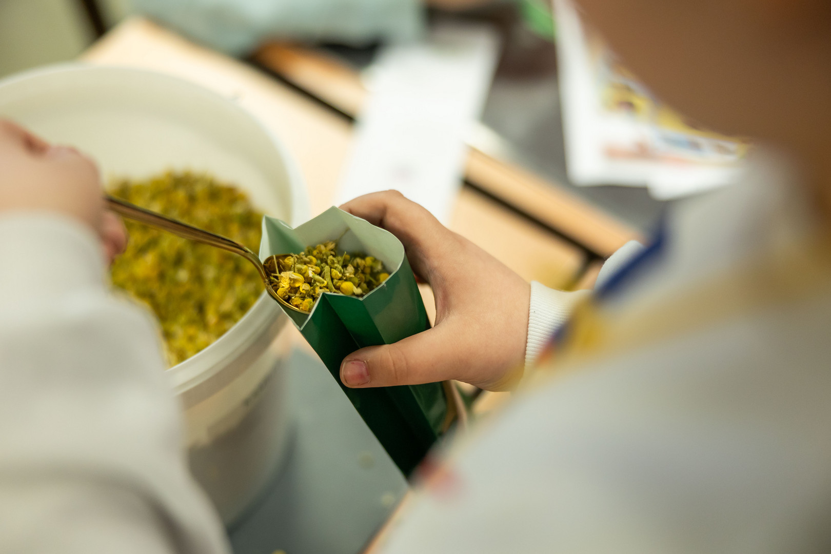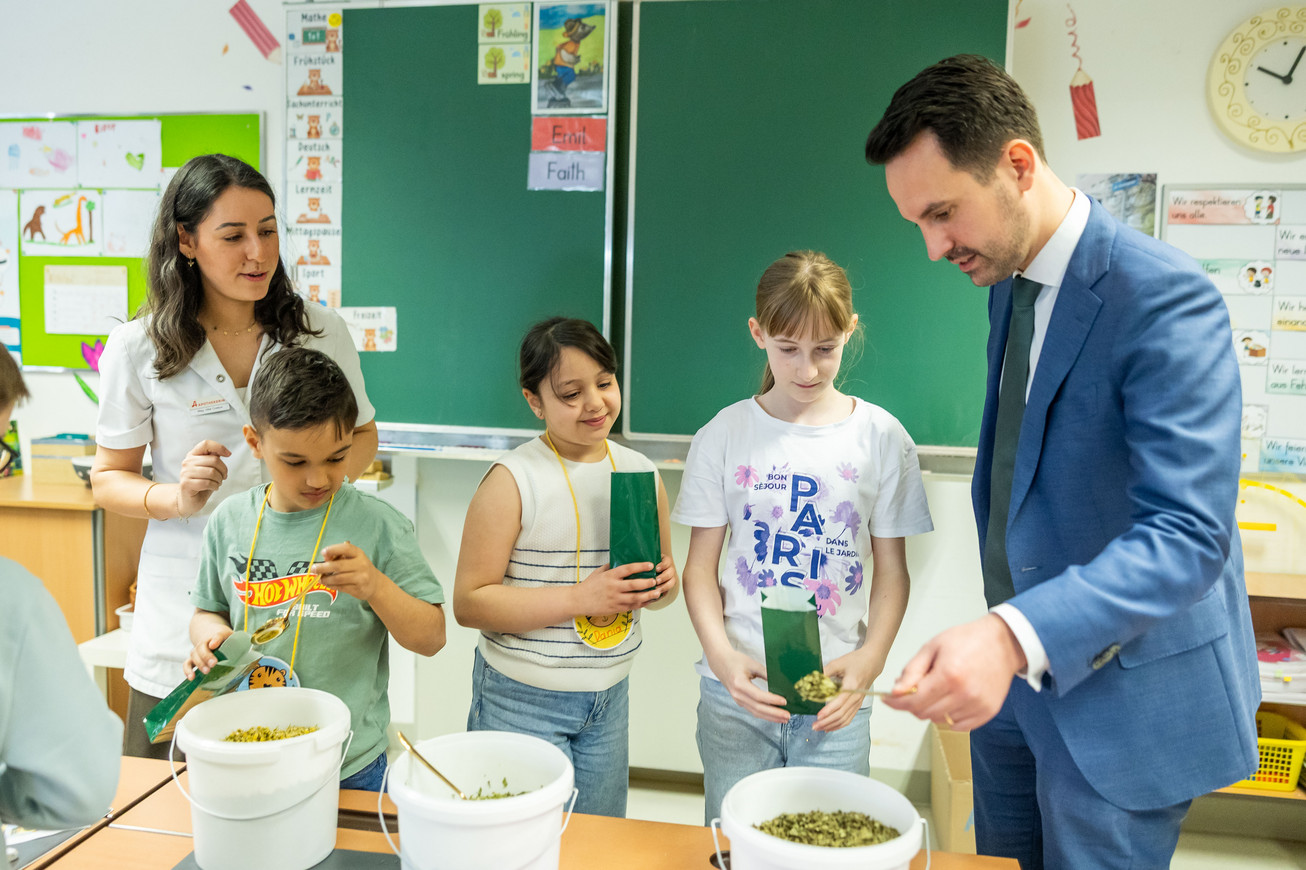 Im praktischen Teil durften die Schüler:innen dann selbst in die Rolle von Apotheker:innen schlüpfen und ausprobieren, wie man einen Arzneitee aus verschiedenen Teesorten mischt und in kleine Säckchen abfüllt. Dabei legte auch der Bildungsminister Hand an und half den Schüler:innen beim Befüllen ihrer Säckchen. Die Schulapotheker:in zeigte außerdem vor, wie in der Apotheke patientenindividuelle Kapseln hergestellt werden – eine Versorgungsleistung der Apotheken, die für Kinder und Jugendliche besonders wichtig ist. Und auch einige bekannte Heilpflanzen und apothekentypische lernten die Kinder kennen.