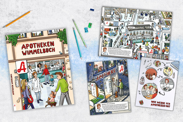 Das Apotheken-Wimmelbuch wurde speziell für junge Apotheken-Besucher:innen (ca. 1,5 bis 6 Jahre) gestaltet. Es nimmt Kinder mit auf eine spannende Entdeckungsreise durch die verschiedenen Räume einer öffentlichen Apotheke und einer Krankenhausapotheke und erklärt altersgerecht die wichtigen Aufgaben und Tätigkeiten der Apotheker:innen. Durch aufklappbare Fenster gibt es die Möglichkeit, Details weiter zu erforschen und beispielsweise einen Blick in einen Lagerroboter, einen Reinraum oder den „Giftschrank“ zu werfen. Das Apotheken-Wimmelbuch ist in vielen Apotheken erhältlich.